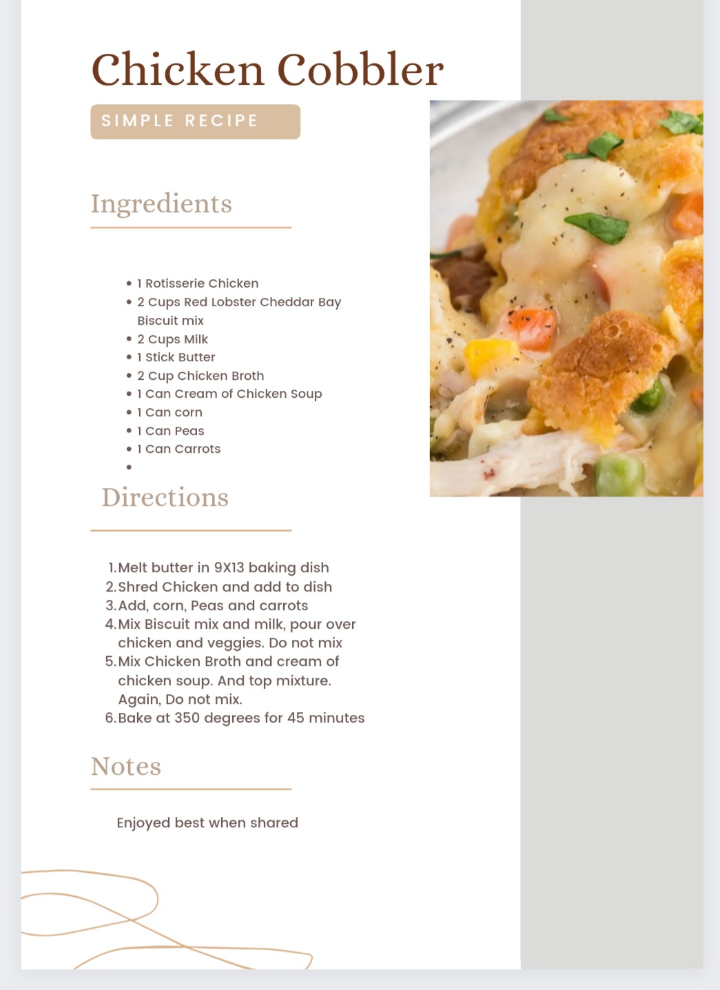 And as usual, quick and easy. You will need a rotisserie chicken, shredded, 1 stick butter, 2 cups Red Lobster Cheddar Bay Biscuits, 2 cups milk, 2 cups chicken broth, 1 can cream of chicken soup, 1 can each of drained, corn, peas and carrots.